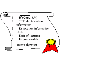 Trent stores PPATA in his protected database, along with a link to (or a copy of) CertA, enabling him to quickly identify the owner of PPATA, whenever this is needed. Trent communicates to Alice H(CertA, RV), that is the output of the hash function applied once on CertA and RV. Trent also communicates to Alice the PPATA itself, the number n and the RV. Alice stores this information at her protected, local repository.